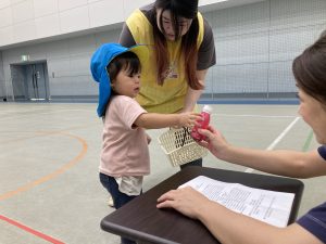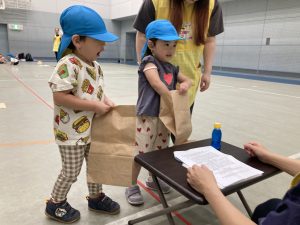 お買い物競争では、カードをめくり、同じ形や色の袋を取ってからお店屋さんに行きました。お店では「ください!」と上手に言えていましたね🍪!