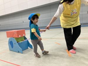 たんぽぽ組さんはワニさんたちを乗せてあげた後、ゾウくんを引っ張ってあげます!