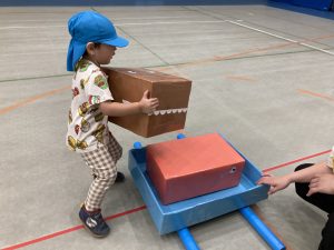 ひまわり組さんはお神輿型のゾウさんに乗せてあげ、大きな池のゴールまで運んだよ☺