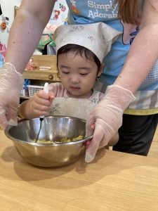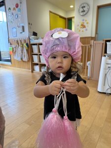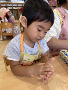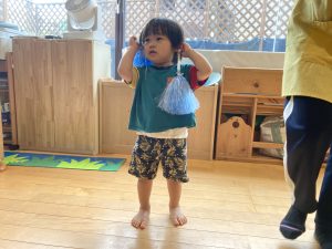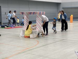 お買い物競争では、カードをめくり、同じ形や色の袋を取ってからお店屋さんに行きました。お店では「ください!」と上手に言えていましたね🍪!