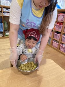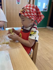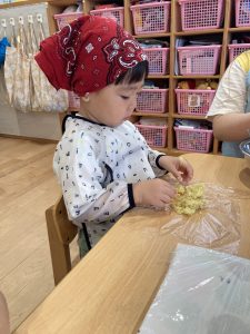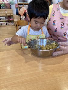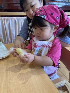 保育園のお団子は、さつまいもで作るスイートポテト団子です。