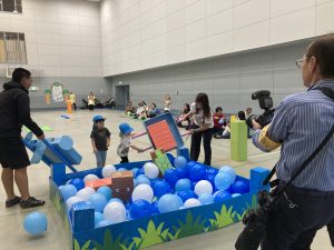 ひまわり組さんはお神輿型のゾウさんに乗せてあげ、大きな池のゴールまで運んだよ☺