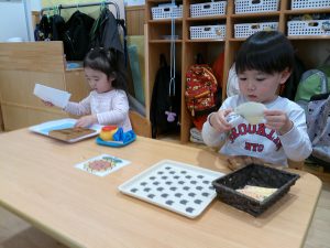 1歳さんも、自分でやりたいお仕事を選んで持って来ています。
