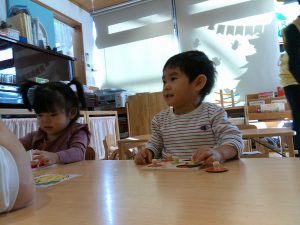 2歳クラスのお友だちは、穴開けパンチや糊付けを楽しんでいました。