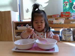 スプーンですくって、お皿からお皿へ…。