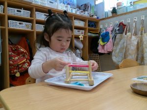手の押す・引っ張る・回す等の動きや、色・大きさ・高さの違い等を、遊びながら体験していました。30分間、しっかり集中して楽しんでいましたよ♪
