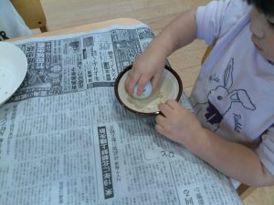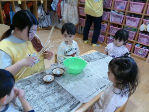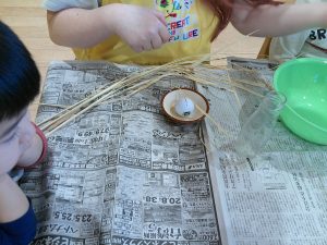 その後、ひまわり組さんは神社で貰った稲の籾摺りをしました。