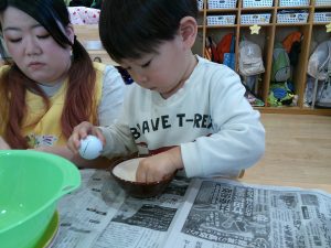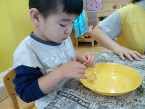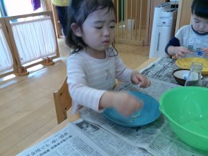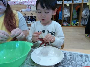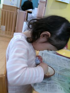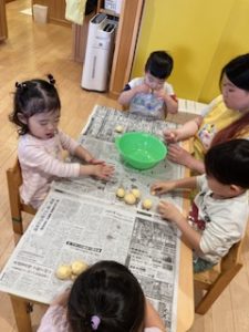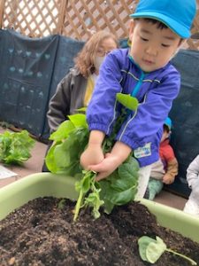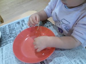 食育の日の給食は、いつもよりモリモリ食べていますよ。食材に触れ食べる喜びを感じていきたいですね。