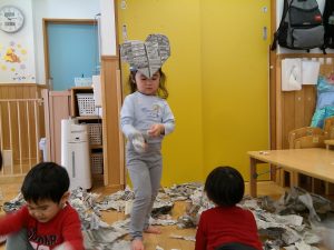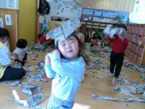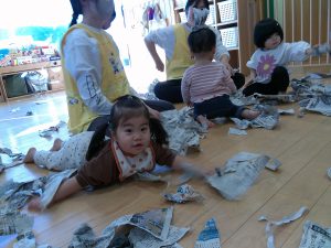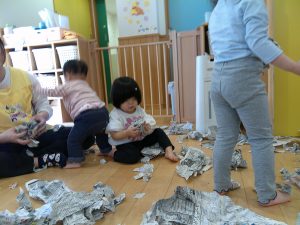 ビリビリと新聞紙を思いっきり破ったり、丸めて投げたり、新聞紙の海を泳いだりと楽しみました♪