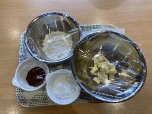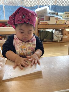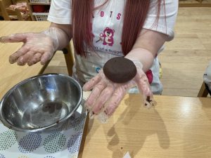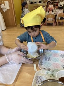 みんなの「がんばれー!」の応援を聞きながら先生がこねこねした、生地を丸める方法を見てからいよいよ成型スタートです✨