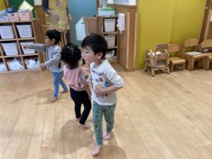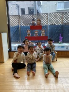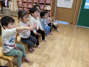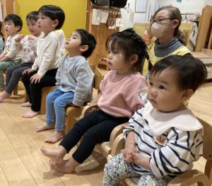 お椅子に座って、ひな祭りの絵本をみました。みんな、夢中ですね。