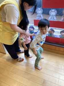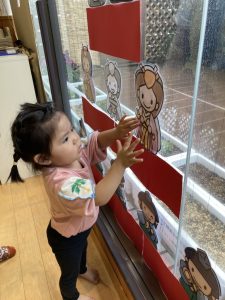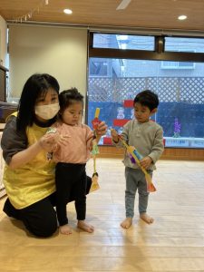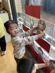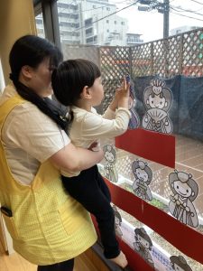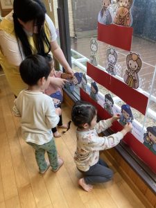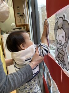 保育室に隠れているひな人形を見つけて、色の無いひな人形をカラフルなひな人形に変身させましたよ✨