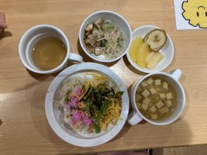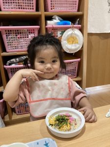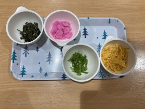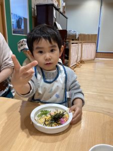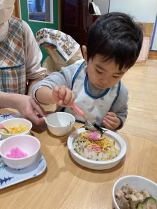 給食では、自分のちらし寿司に好きなものをトッピングしました。